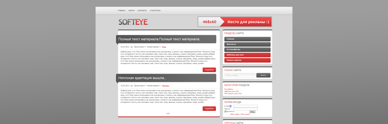 Softeye - это красивый шаблон для uCoz выполненный в серых, белых и красных цветах. Шаблон имеет чистый код и отображается одинаково на всех известных браузерах.